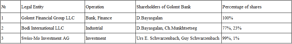 | Golomt Financial Group LLC /GFG/ | Golomt Financial Group LLC is a financial group holding company and the major shareholder of Golomt Bank. It holds equity investments in financial sector businesses (such as insurance and brokerage) and is solely owned by Mr. Bayasgalan Danzandorj, who is the ultimate beneficiary owner, one of the founders, former CEO and former Chairman of Golomt Bank. |