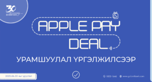 Голомт банк хамгийн хялбар, найдвартай төлбөрийн хэрэгсэл болох Apple Pay үйлчилгээг ашигладаг харилцагч нартаа зориулан “Apple Pay Deal” урамшууллыг хэрэгжүүлж байна.